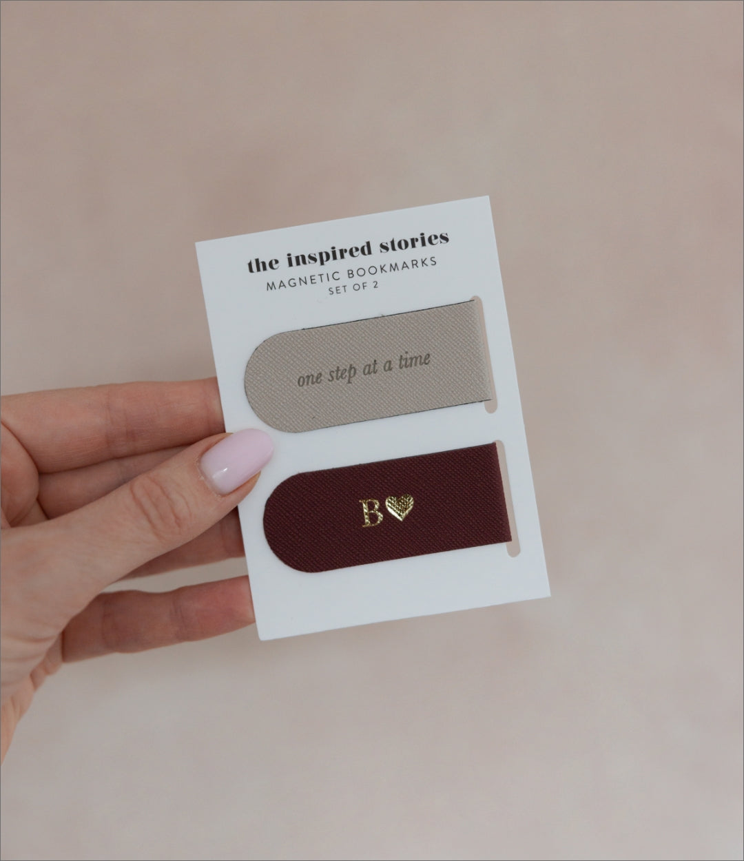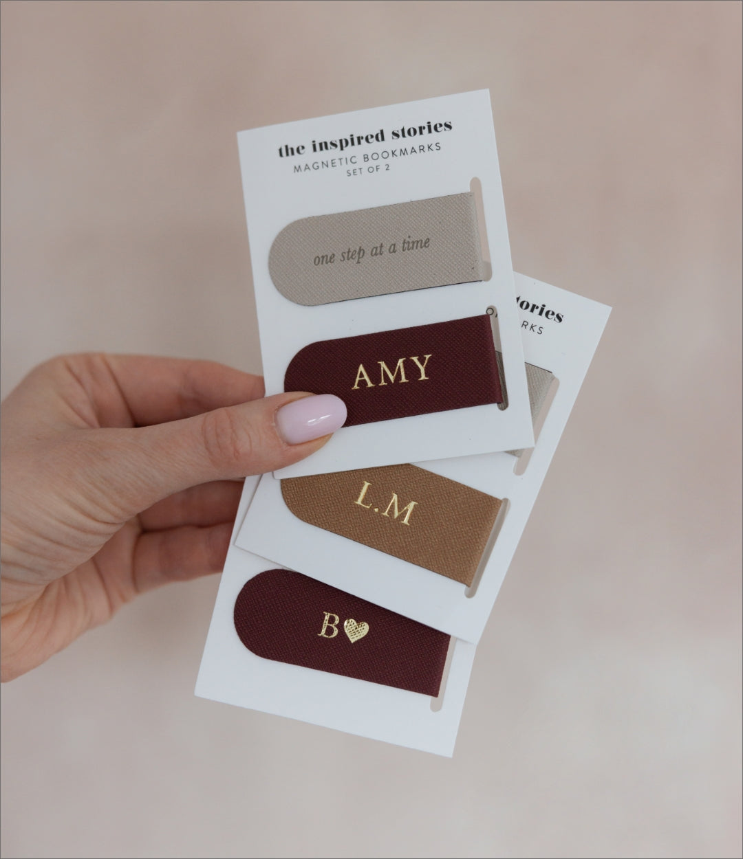 Set includes two magnetic bookmarks: One with embossed phrase (grey) and another blank (taupe or burgundy) with option to personalise