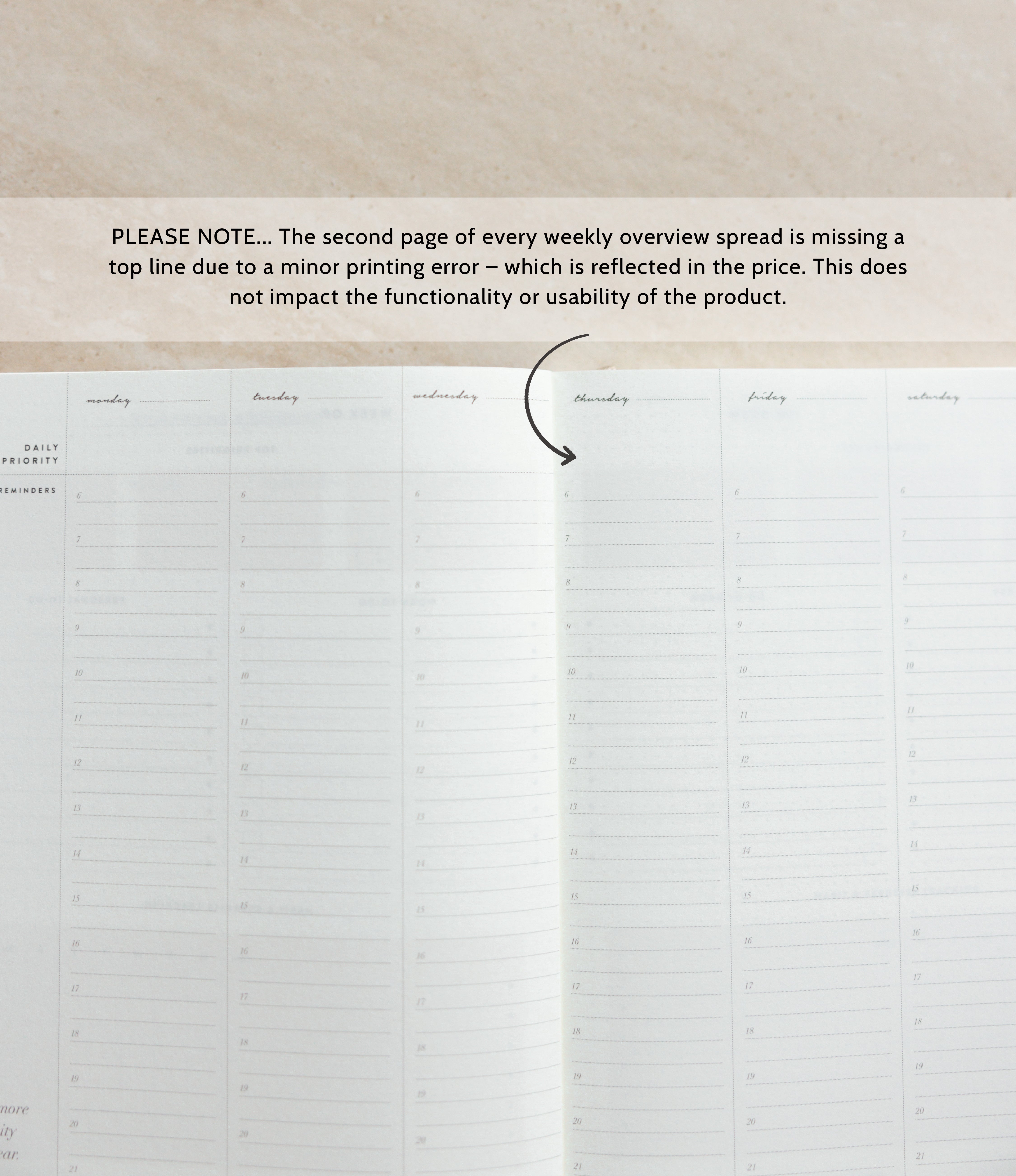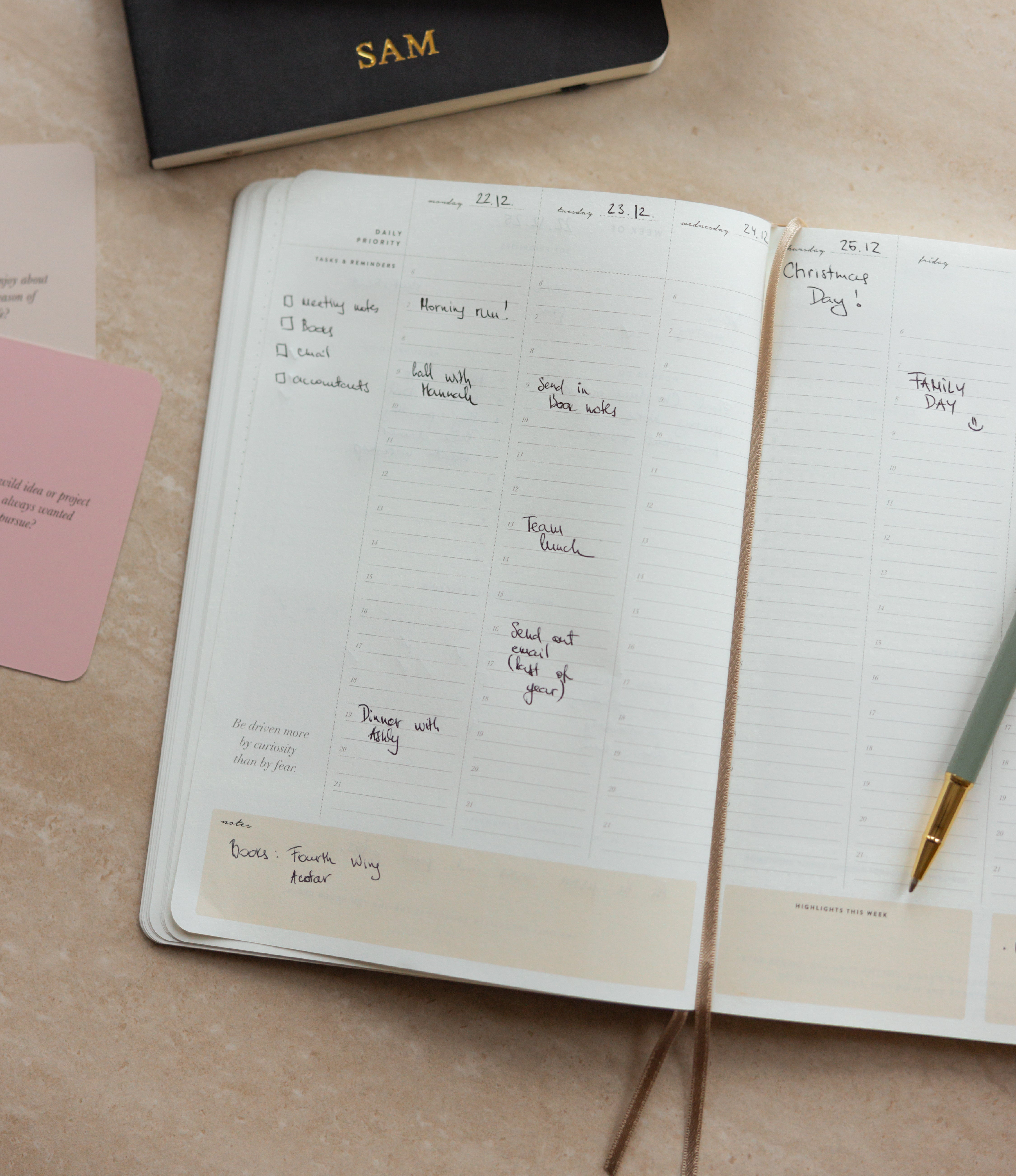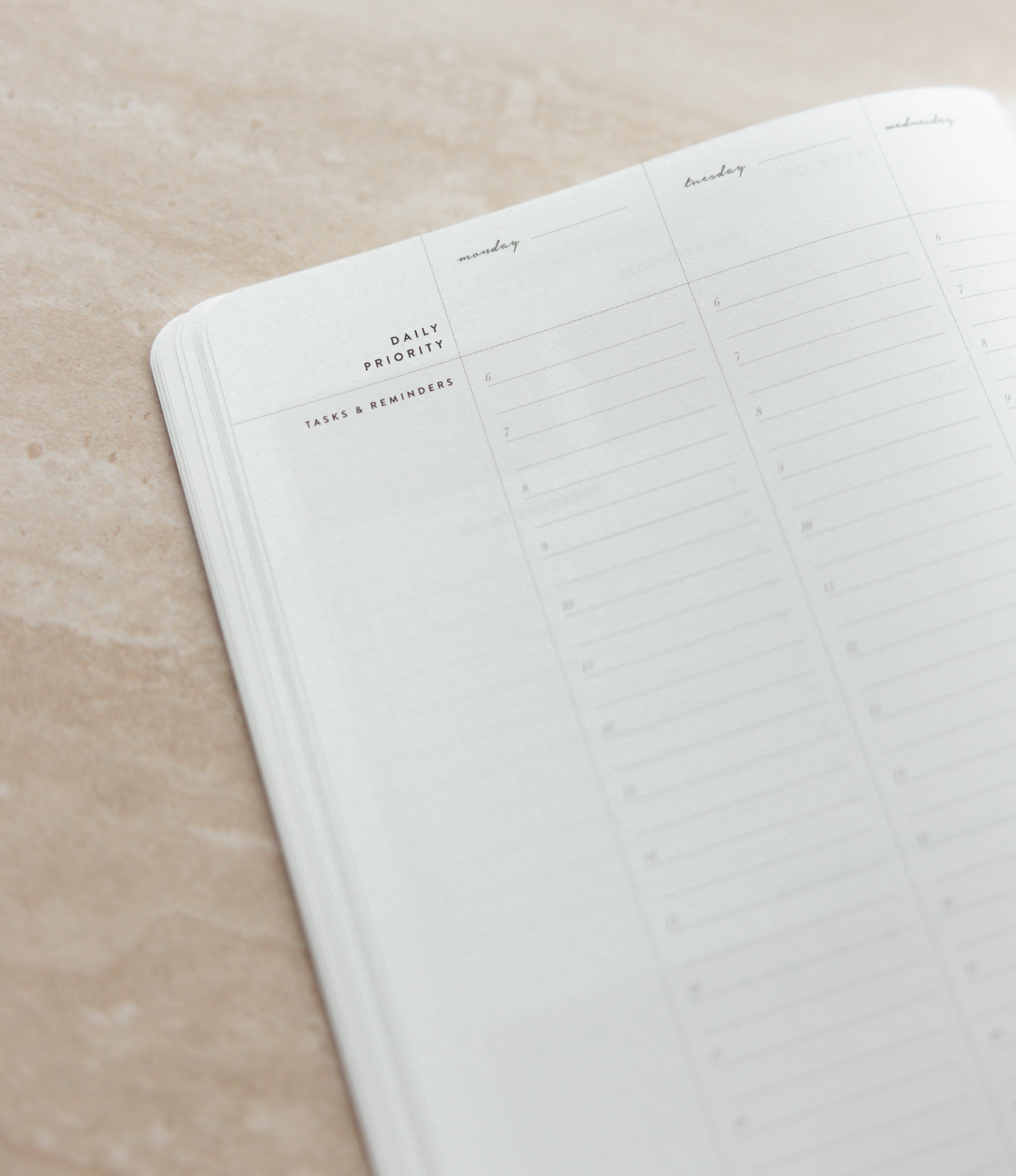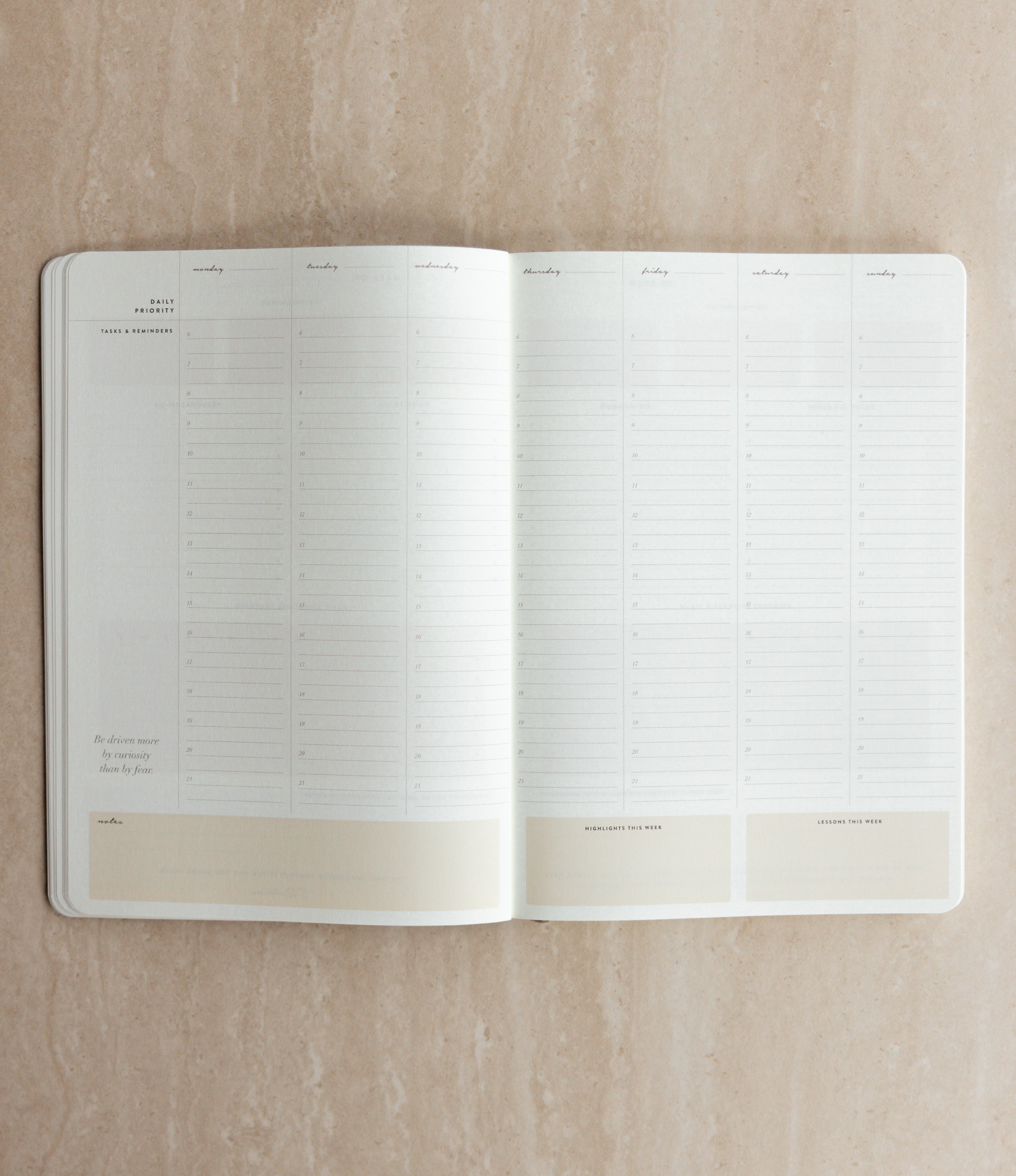 Your everyday agenda for 6 months, or 26 weeks. This vertical-style layout features a daily 6am–9pm schedule, making it easy to plan appointments, prioritise to-dos, and create a clear, time-blocked overview of your day — all within a weekly overview spread.