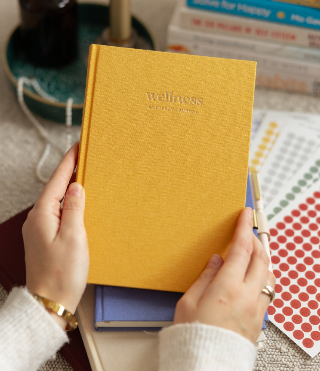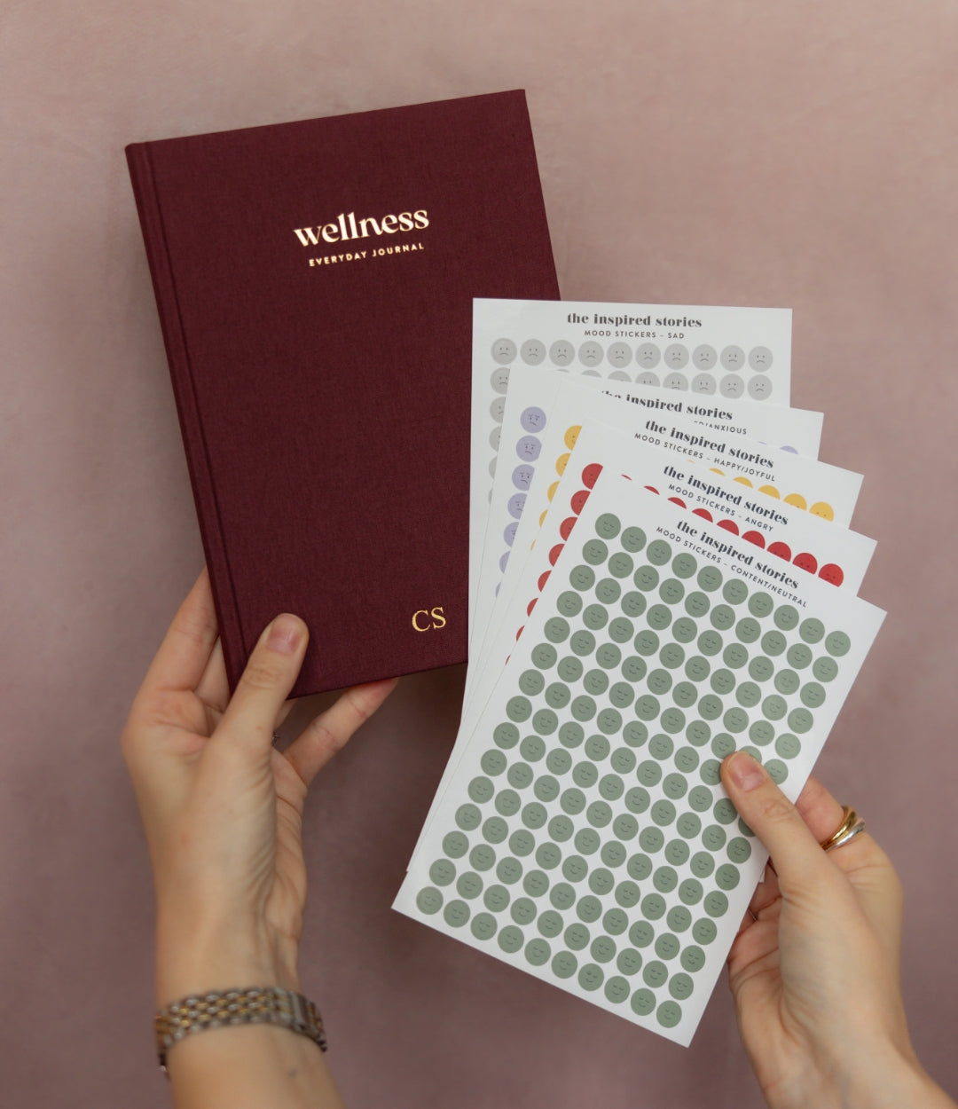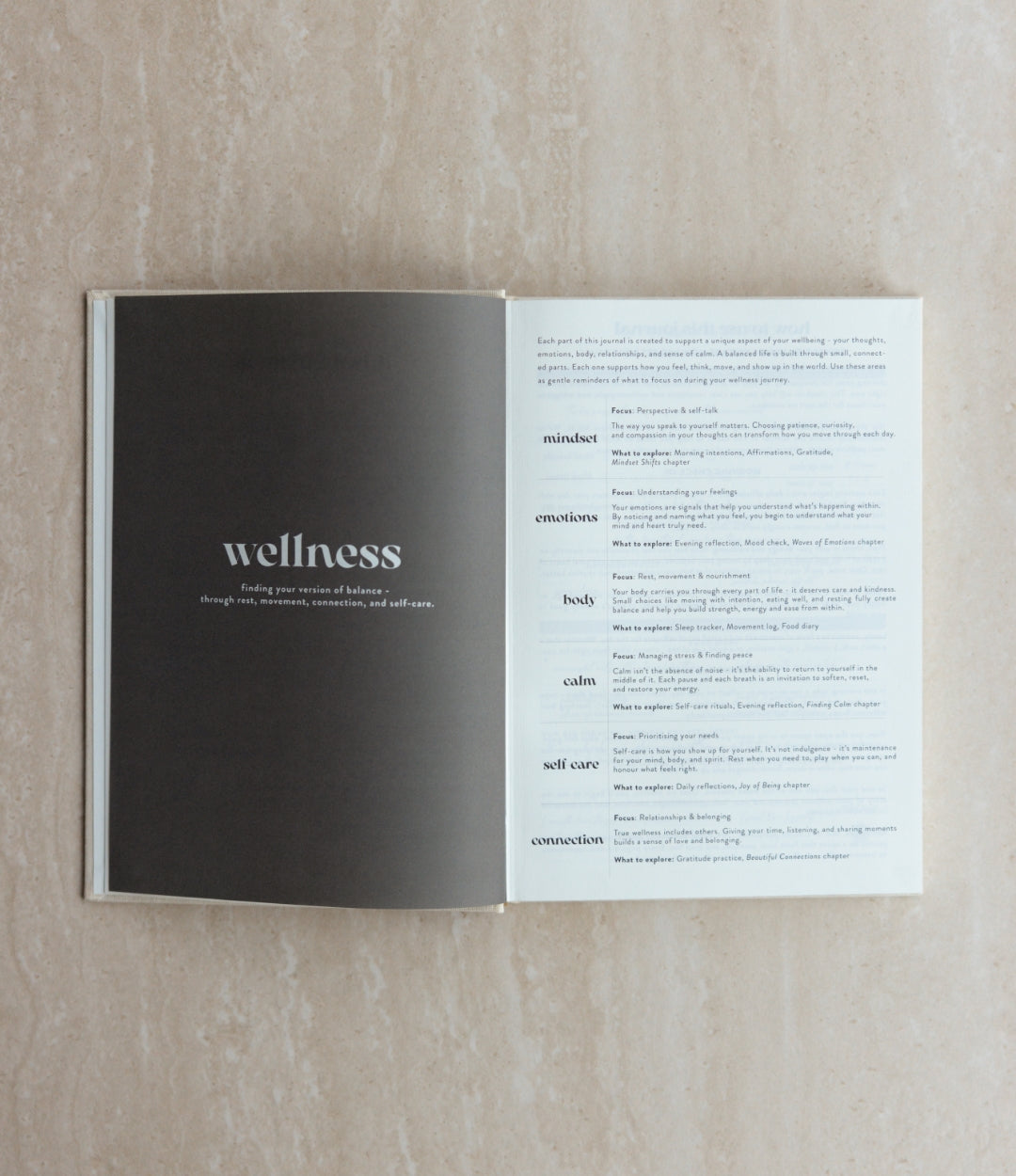 Inside, you’ll find wellness tools like a wellness wheel, habit trackers, mood tracking, and thoughtful mini chapters focused on mindset, stress management, emotions, connection, and self-care.