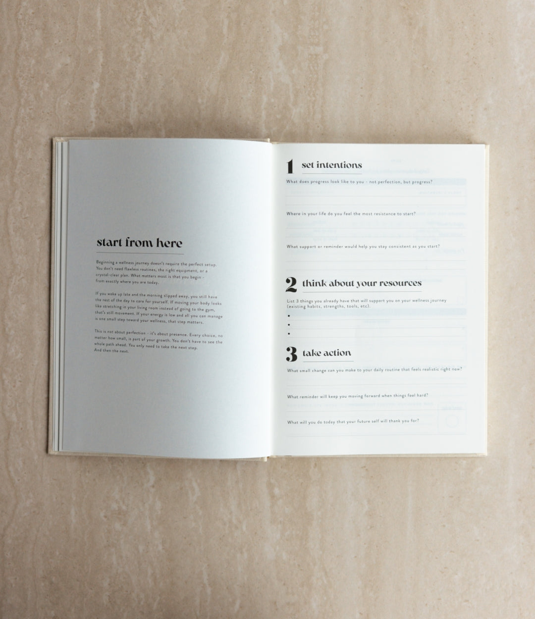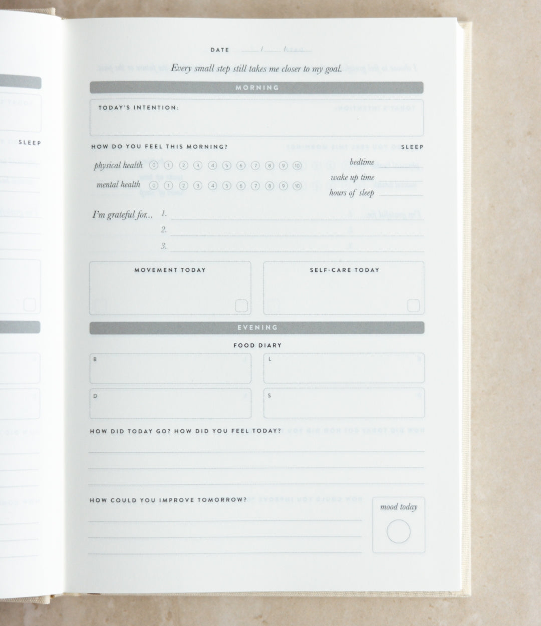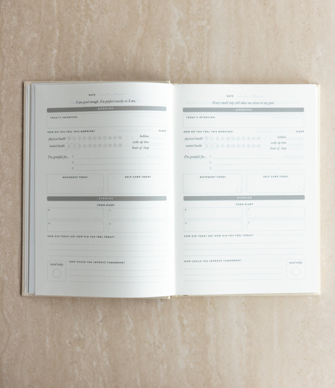 6-month undated wellness journal designed to support you physical, mental and emotional wellbeing through simple daily rituals. With guided morning and evening check-ins, intention setting, gratitude, movement, self-care, and reflection, it helps you build awareness and balance in your everyday life.